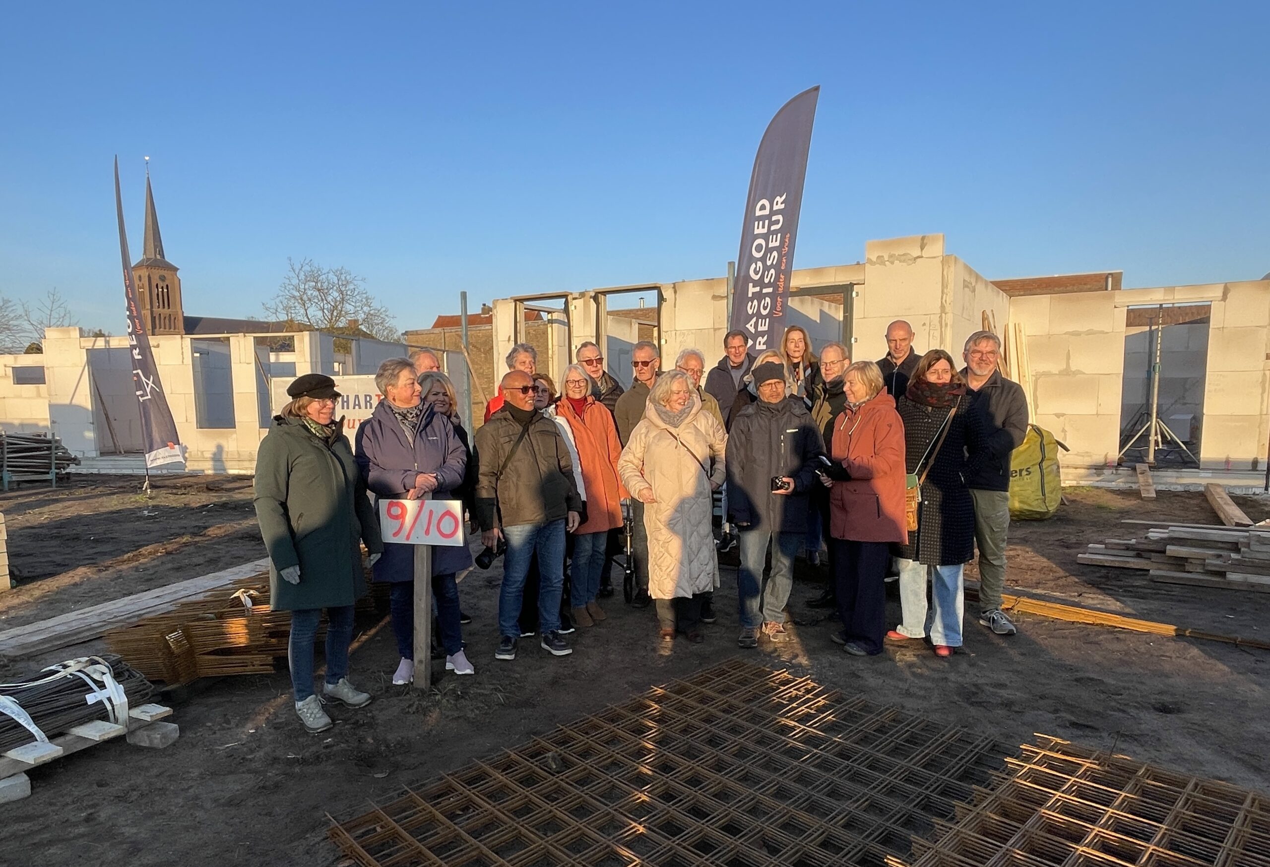 Op een gure maar strakblauwe dag legden de 23 aanstaande bewoners allemaal hun eerste steen: Kavel 9 heeft daardoor een blijvende herinnering: dat stukje muur werd natuurlijk niet zo mooi als de metselaars het doen op de bouw 🙂